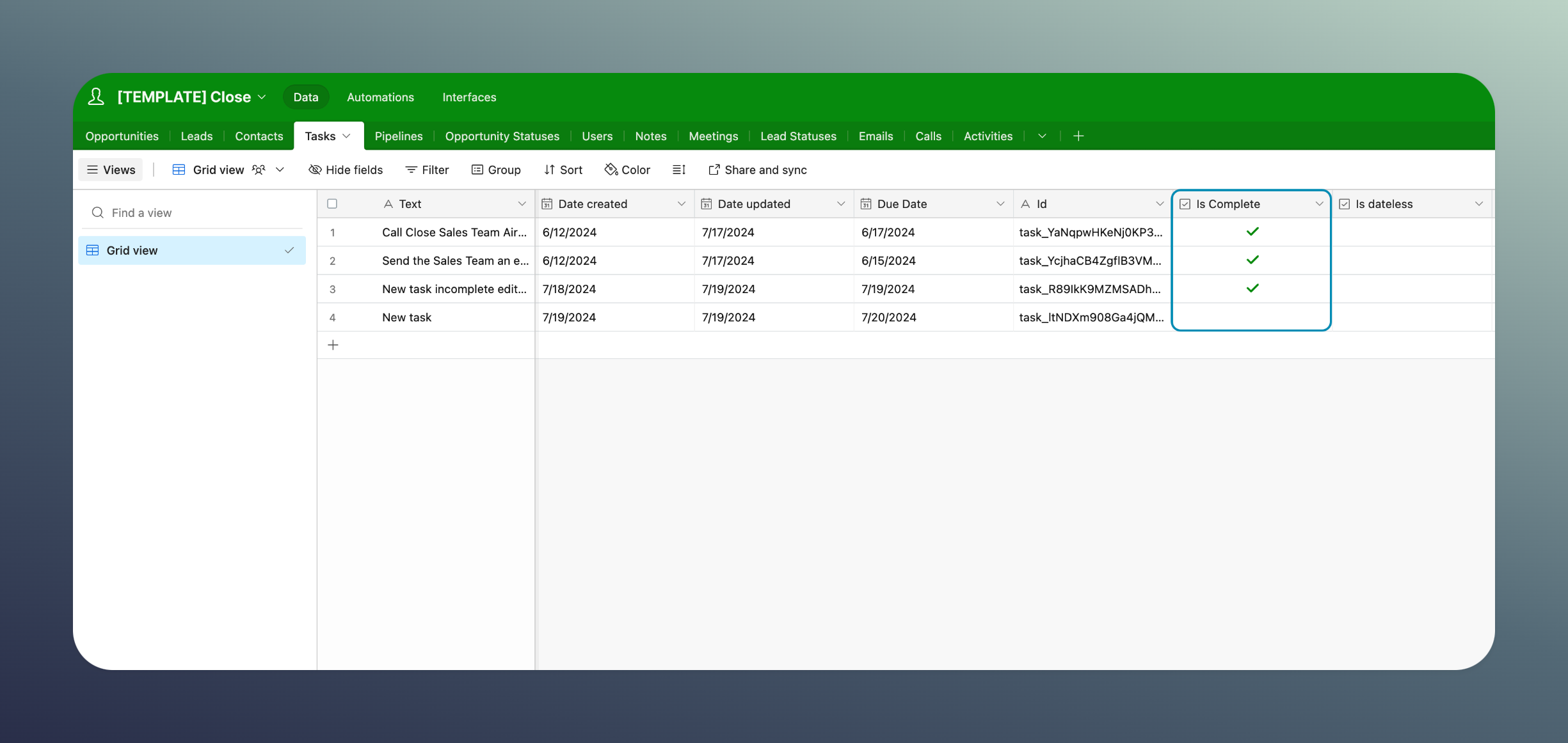 Record deletes for the 'Tasks' table are synced by updating the "is\_complete" property on the destination app (i.e Airtable, Notion).