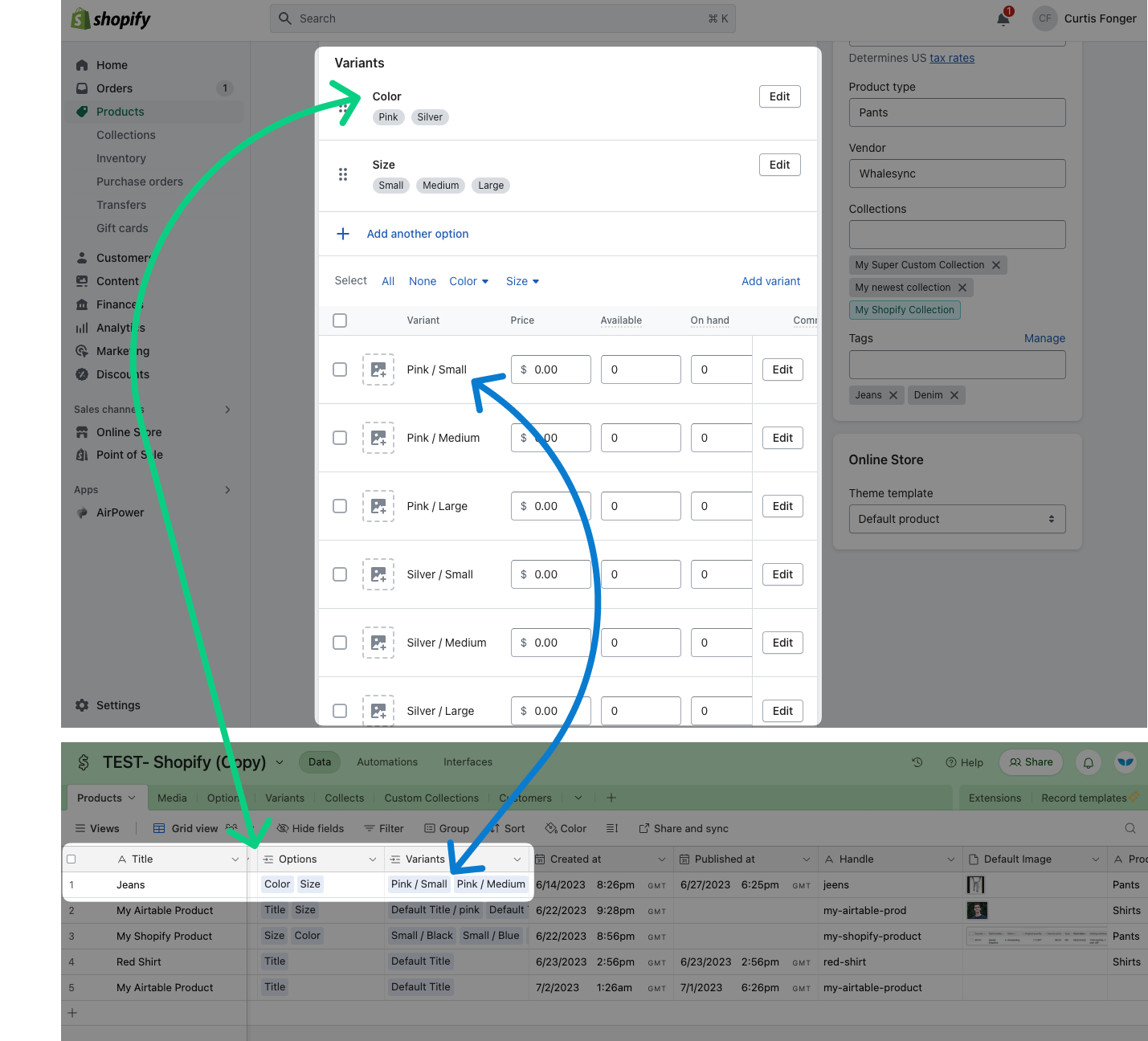 * If you want to create new Variants from Airtable, you must create them by adding *Options* (just like you would in Shopify).